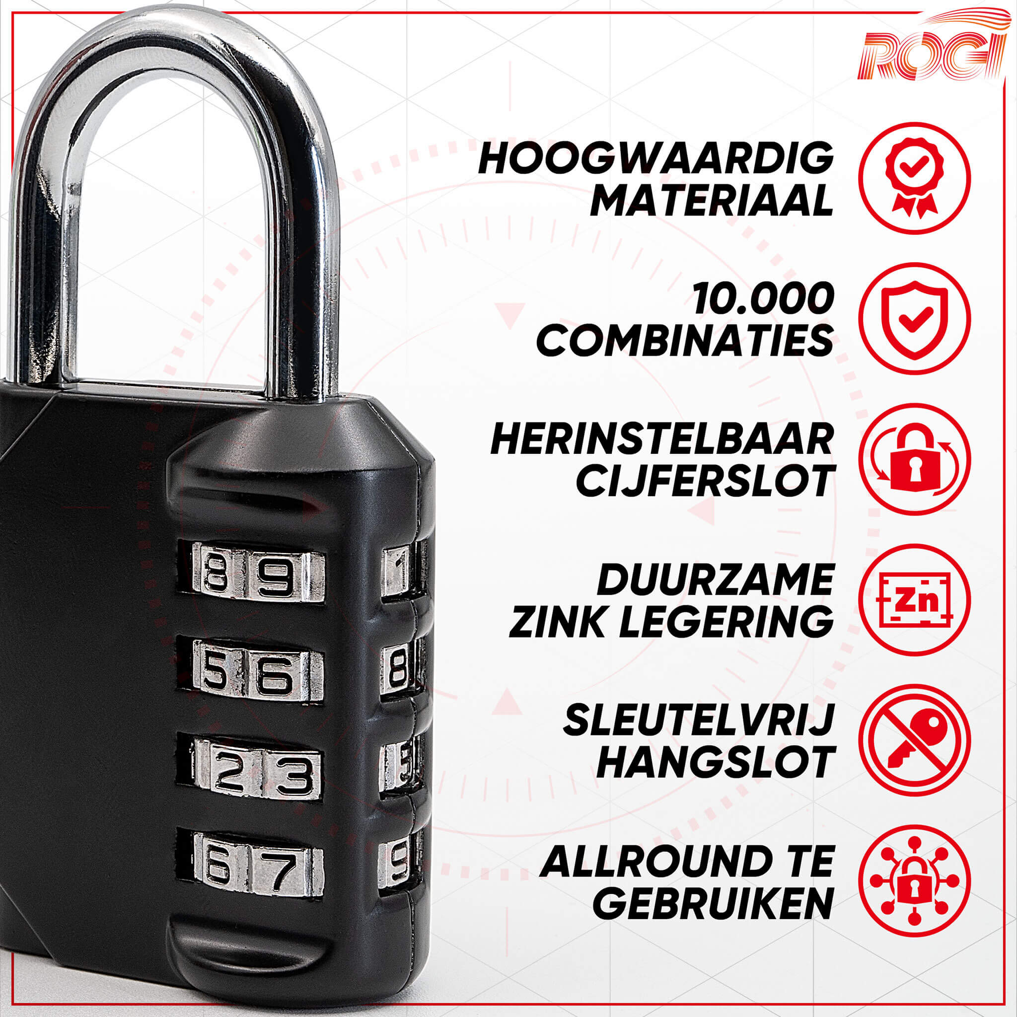 Met ons geavanceerde cijferslot kunt u een persoonlijke combinatie van cijfers kiezen die alleen u kent. Geen gedoe meer met het bijhouden van sleutels of het onthouden van ingewikkelde wachtwoorden. Met slechts een paar eenvoudige stappen kunt u uw persoonlijke code instellen en uw waardevolle spullen veilig houden.