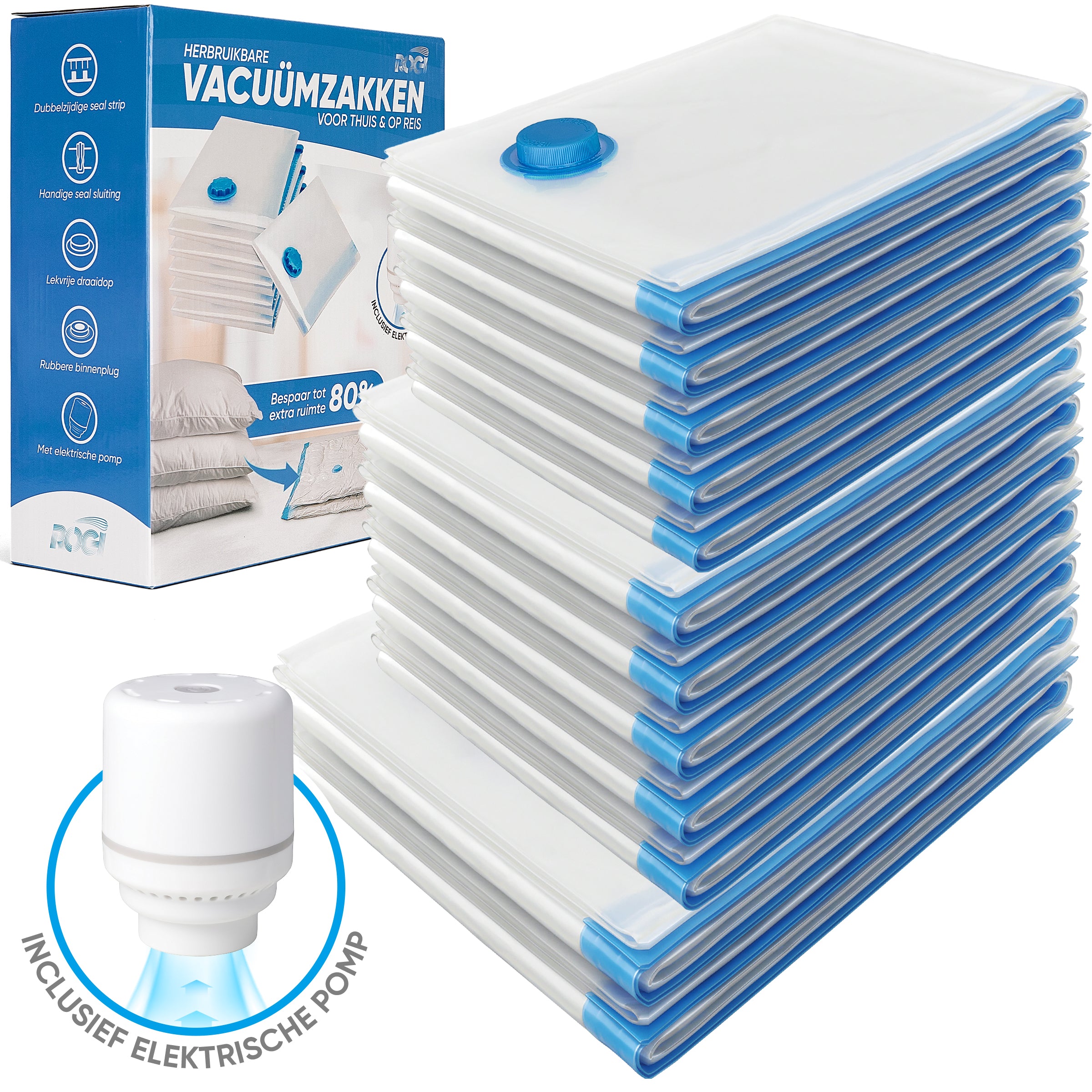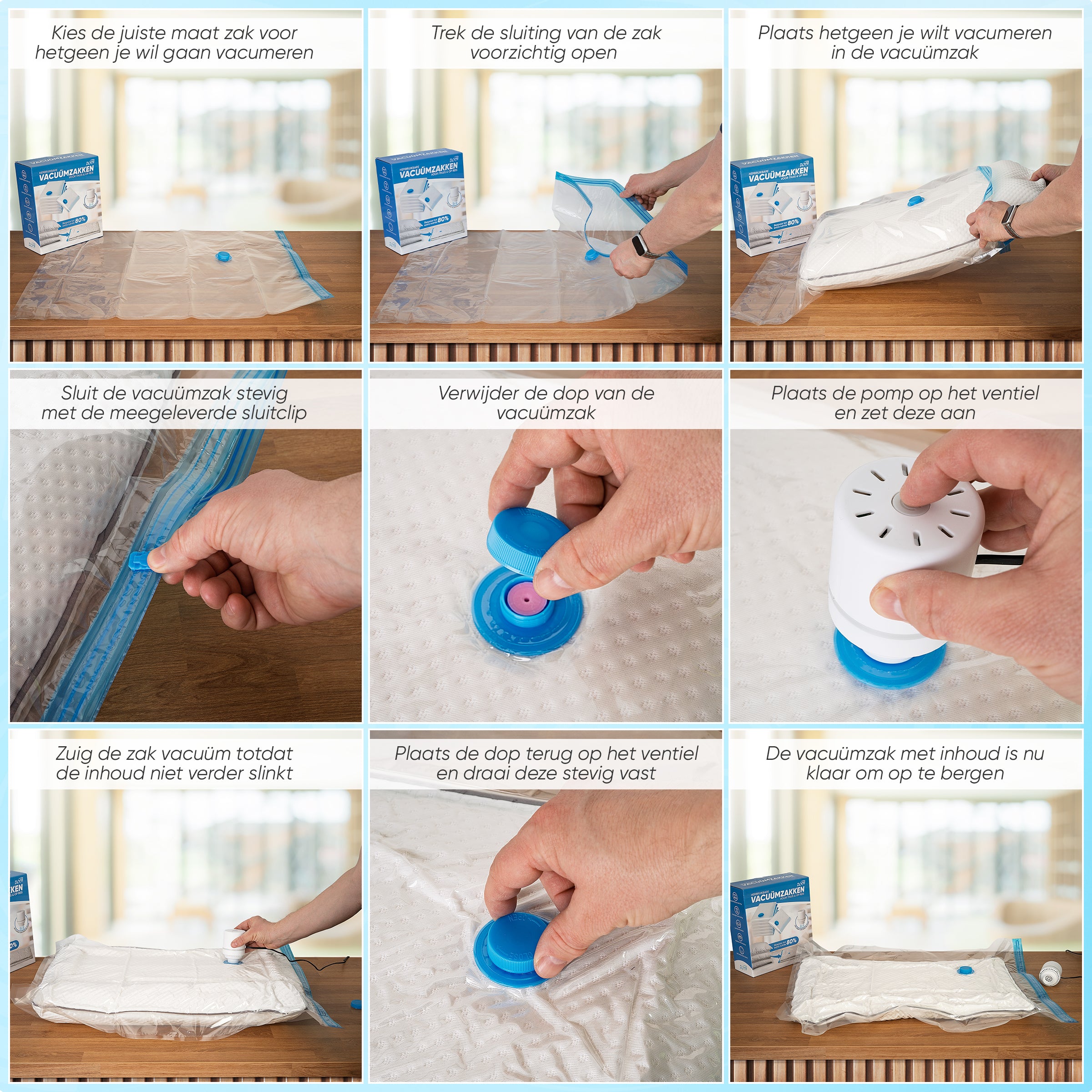 De set wordt geleverd met een handige elektrische pomp, waarmee je in een handomdraai de lucht uit de zakken zuigt. Geen gedoe met handmatig pompen – binnen enkele seconden is je vacuümzak klaar voor gebruik!