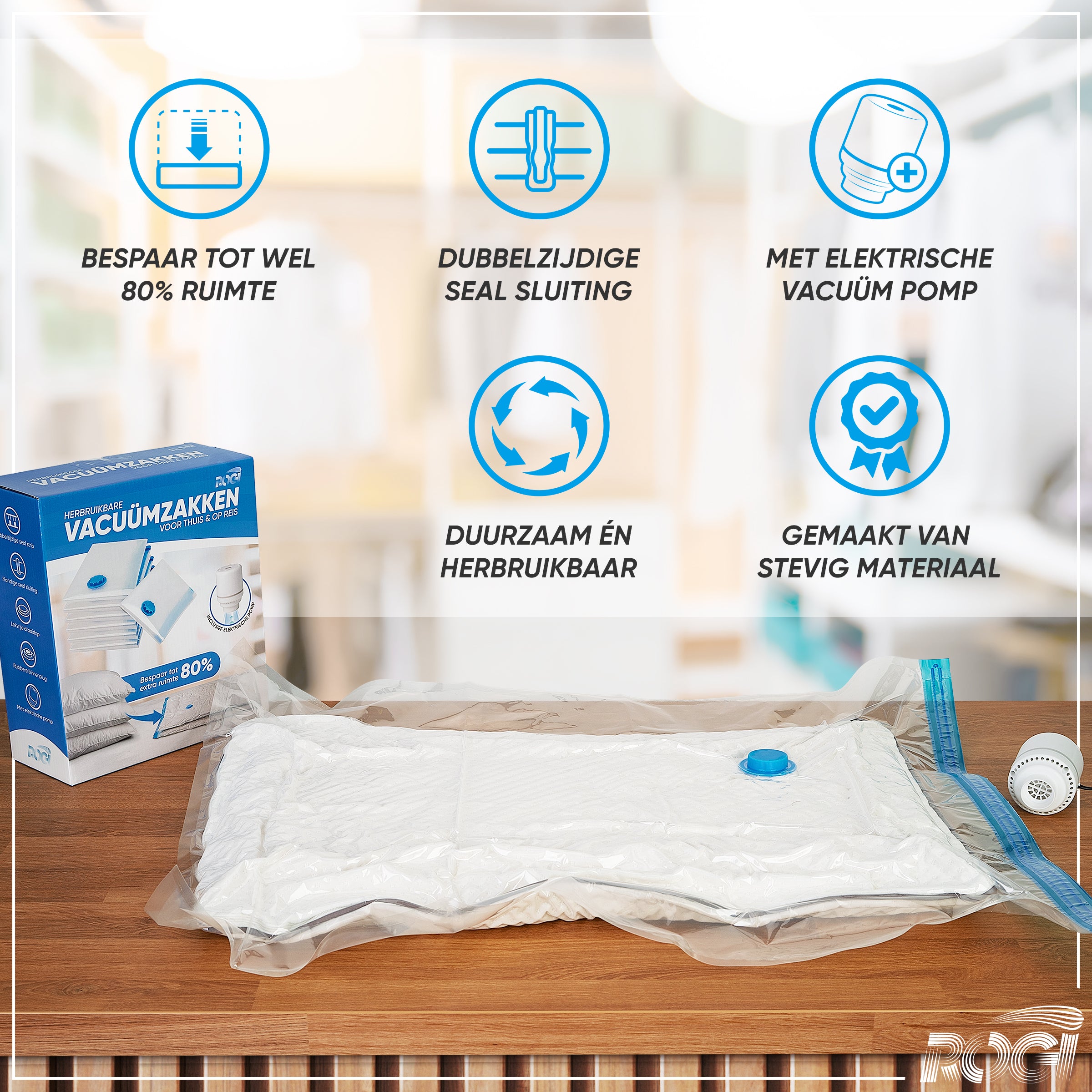Met de herbruikbare vacuümzakken van Rogi creëer je moeiteloos extra ruimte in je koffer of kast. Of je nu op reis gaat of je kleding, dekens en kussens thuis wilt opbergen, deze zakken zijn de perfecte oplossing. Dankzij het slimme ontwerp bespaar je tot wel 80% ruimte, zodat je meer kunt meenemen of je opslagruimte optimaal kunt benutten.